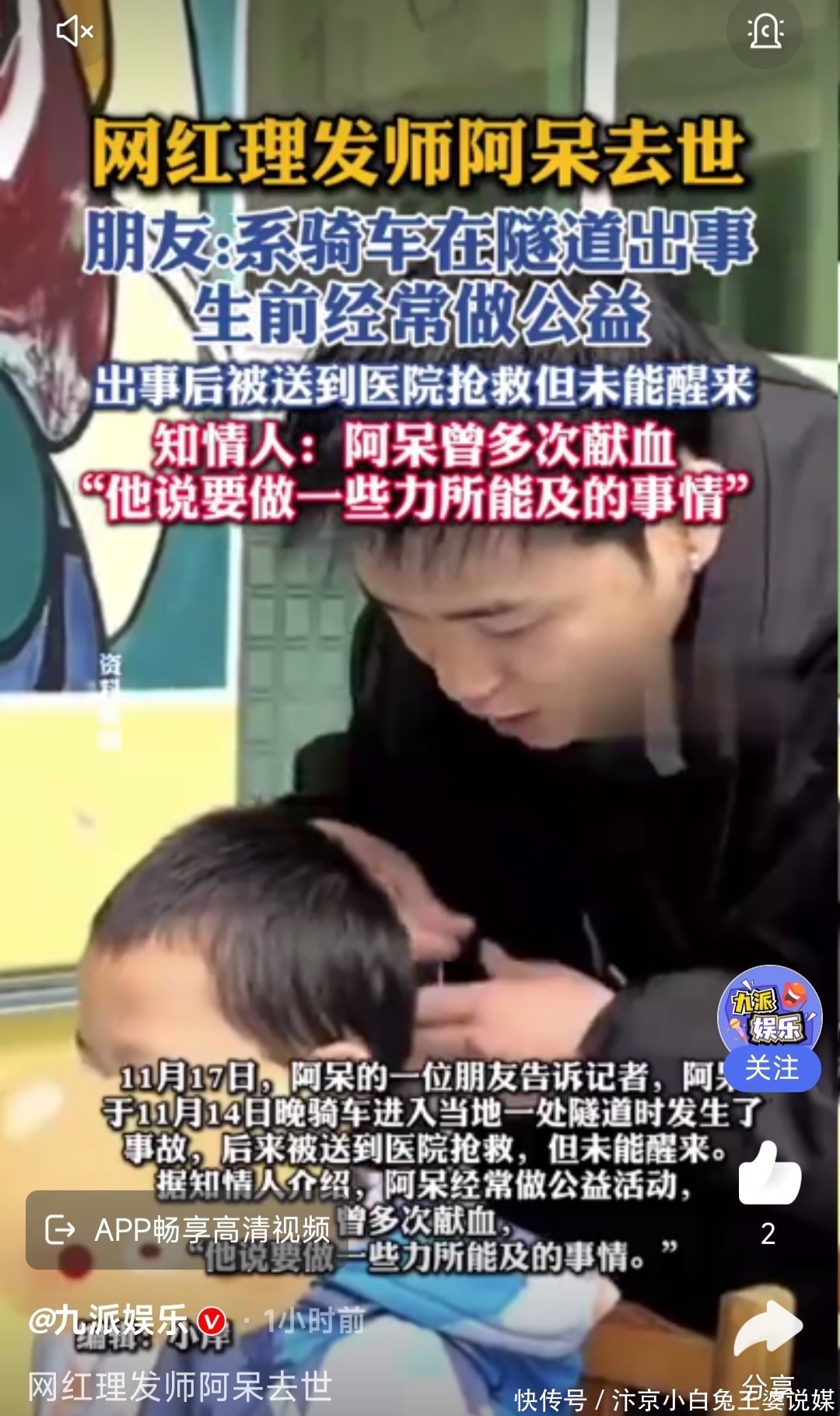 消息传开后,网友们纷纷在他的视频下留言悼念。"前几天还看你给孩子剪头发的视频,怎么突然就没了""去年特意找你剪过头发,技术好还特别耐心",评论区里满是惋惜的话语。有人提议把店继续开下去,"留一个位置给他",也有人翻出他的公益视频,"谢谢你为孩子们剪过的头发"。